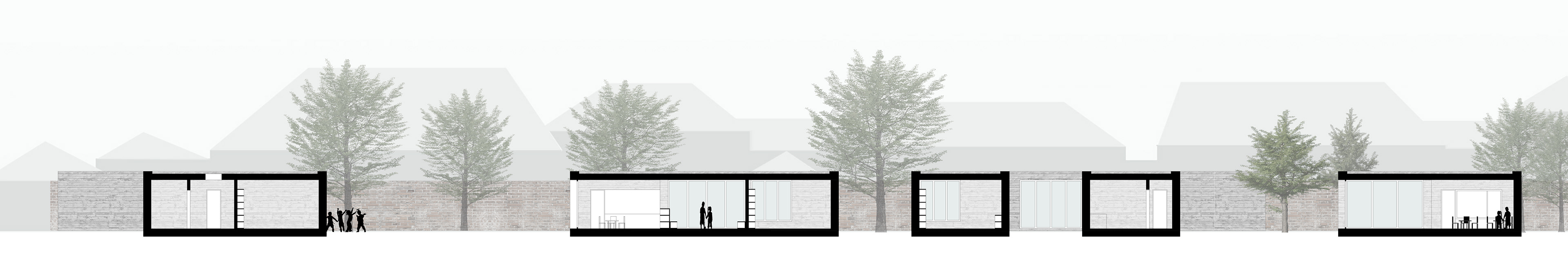 The design consists of 7 single-story building complexes that relate to each other and unite in harmony with the garden to create a microcosm for children. The interaction of interior and exterior space is the basis of our design. The site is transformed into a grid of 5.25m x 5.25m, into which each of the buildings fits.